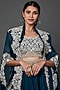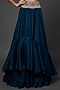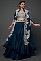 Featuring a peacock blue tiered lehenga in satin and organza base. It is paired with a matching organza butterfly cape having thread and mirror work, including dupion mirror work blouse.
