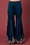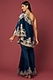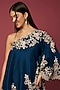 Featuring a peacock blue off-shoulder dress in dupion, silk and organza base with thread and pearl work. It is paired with matching organza gharara pants.