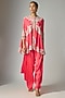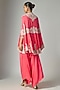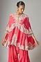 Featuring a pink ariya cape in dupion silk base with embroidery. It is paired with satin pants. Accentuate it with dangler earrings and block heels for festive occasion or sangeet ceremonies.