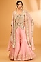 Featuring a pink butterfly cape in organza base with patchwork. It is paired with a waistcoat, including a silk and organza embroidered gharara pants. Accentuate it with statement earrings and heels for a sangeet or engagement ceremony.