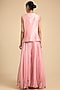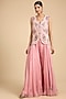 Featuring a pink cape in silk and organza base with pearls, thread and floral jaal work. It is paired with an embroidered waistcoat and organza sharara. Style it with zircon jewellery and block heels for an elegant look, perfect for a sangeet or wedding ceremony.