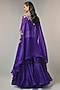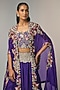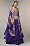Featuring a purple cape in organza base. It is paired with a blouse and a two tiered skirt. Accentuate it with dangler earrings and heels for a reception, wedding, sangeet or engagement ceremony.