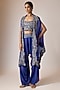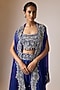 Featuring a purple butterfly cape in organza base with mirror embroidery. It is paired with an embroidered top and satin pants. Accentuate it with dangler earrings and block heels for festive occasion or sangeet ceremonies.