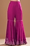 Featuring a rani pink ariya cape in dupion base with thread and pearl work. It is paired with a matching organza gharara pants having pearl work.