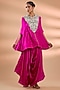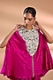 Featuring a rani pink cape in dupion base with embroidery. It is paired with satin pants. Accentuate it with dangler earrings and heels for a festive occasion, cultural event, sangeet or pooja ceremony.