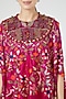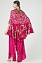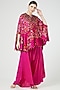 Featuring a rani pink cape in dupion base with thread embroidery. It is paired with matching satin pants.