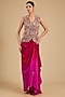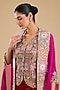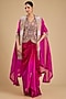 Featuring a rani pink cape in organza base. It is paired with an embroidered waistcoat and a silk pick-up skirt. Accentuate it with polki or zircon jewellery and embellished heels for a sangeet or wedding ceremony.