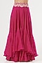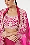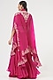 Featuring a rani pink cape in organza base with thread and pearl work. It is paired with a matching blouse and silk organza tiered skirt.