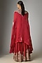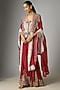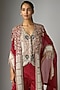 Featuring a red butterfly cape in organza base with patchwork. It is paired with an embroidered waistcoat, including a silk and organza gharara. Style it with statement chandbali earrings, metallic heels, and a sleek clutch for a refined look. Perfect for festive gatherings, wedding functions or evening occasions.