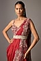 Featuring a red ruffled pick-up skirt in organza base. It is paired with a silk embroidered blouse and a drape dupatta. Accentuate it with dangler earrings and heels for a festive occasion, wedding or engagement ceremony.