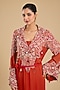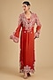 Featuring a red maxi dress in silk base with mirror work. Accentuate it with zircon jewellery and embellished heels for a sangeet or wedding ceremony.