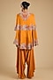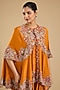 Featuring a rust orange cape in dupion silk base with mirror work. It is paired with satin pants. Accentuate it with polki or pearl jewellery and embellished heels for a sangeet or wedding ceremony.