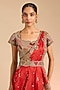 Featuring a rust orange skirt in silk and organza base. It is paired with an embroidered blouse, a drape dupatta and a belt. Accentuate it with kundan jewellery, embellished heels and a clutch bag for a complete look. Perfect wear for an engagement or sangeet ceremony.