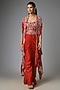 Featuring a rust butterfly cape in silk and organza base with mirror work. It is paired with a top and draped pants. Accentuate it with statement mirror work earrings, metallic heels and a sleek clutch for a striking ensemble, ideal for sangeet celebrations, cocktail evenings or pre-wedding festivities.