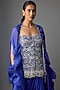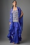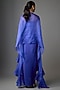 Featuring a violet cape in silk and organza base with embroidery. It is paired with an embroidered corset and a pick-up skirt. Accentuate it with heels and statement earrings for festive occasions, sangeet or cocktail ceremonies.