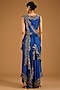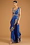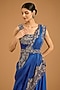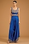 Featuring a violet blouse in silk and organza base with embroidery. It is paired with a draped dupatta, silk embroidered pants and an embroidered belt. Accentuate it with zircon or swarovski jewellery and embellished heels for a sangeet or cocktail ceremony.
