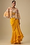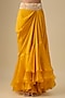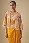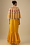 Featuring a yellow cape in dupion silk base with thread and jaal work. It is paired with a blouse and an organza pick-up skirt. Accentuate it with statement earrings and block heels for a wedding, sangeet or haldi ceremony.