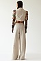 Featuring a beige overlapped pain stain jacket in raw linen base with applique, thread and bead work, including structured semi-circular sleeves. It is paired with matching trousers.