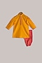Featuring a pink jacket in cotton silk base with peacock print. It is paired with contrasting golden yellow kurta and churidar pants.