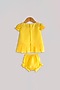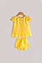 Featuring a yellow dress in muslin base with pearl embroidery. It is paired with matching bloomers.