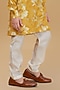 Featuring a yellow kurta for boys in rayon base with floral print. It is paired with cream pants. Accessorise it with pair of mojaris and a watch for a stylish ensemble, ideal for festive occasions or haldi ceremony.