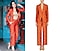 This set features a burnt orange blazer in silk base with foil printed motifs on the front and back. It is paired with burnt orange foil printed silk pants.
