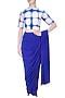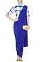 Featuring a royal blue pre stitched drape saree in jersey fabric. It comes along with blue and white tie and dye blouse in cotton.