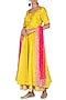 Featuring a yellow anarkali in chanderi and dupion silk base with sequins, cutdana and zari embroidery. It is paired with contrasting pink dupatta in net base having layered border design.
