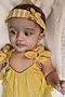 Featuring a yellow jumpsuit for girls in cotton handloom base with stripe print. It is paired with a shoe and hairband. Style it with hair accessories and sandals for a birthday party or playdate.