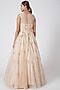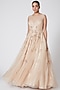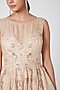 Featuring a champagne gold gown in silk organza base with sequins, glass pipes, and bead embroidery. It has a boat and sweetheart neckline.