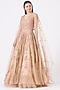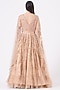 Featuring a dusty coral gown in organza base with sequins and beaded embroidery including cape sleeves.