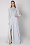 Featuring a powder blue gown in royal georgette base with glass beads and sequins embroidery. It has asymmetrical zipper opening, overlapping slit sleeves, thigh high slit, and shantoon underlining.