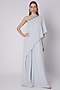 Featuring a powder blue jumpsuit in royal georgette base with glass beads and sequins embroidery. It has an asymmetric drape and shantoon underlining.