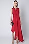 Featuring a red panelled dress in royal georgette base with glass beads and sequins embroidery. It has an asymmetric hemline.