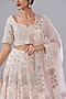 Featuring a baby pink lehenga in organza and chanderi base with aari embroidery. It is paired with a matching floral blouse and a dupatta.