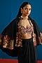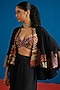 Featuring a black cape in silk base with embroidery. It is paired with a bustier and a satin draped skirt. Accentuate with statement jewellery and heels for a sangeet ceremony.