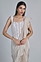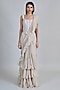 Featuring a champagne and ivory ruffled saree in organza and crepe base. It is paired with a tulle corset. Accentuate the designer set with silver jewellery, embellished heels and a potli bag, perfect for your engagement, sangeet or cocktail ceremony.