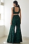 Featuring a dark green crop top in organza base with 3D floral work. It is paired with matching pants having 3D floral and hexagon embroidery.