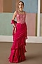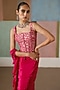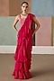 Featuring a fuchsia ruffled saree in crepe and organza base. It is paired with an embroidered tulle corset. Accentuate it with statement earrings and heels for a wedding or sangeet ceremony.