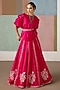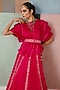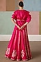 Featuring a fuchsia skirt in organza base with embroidery. It is paired with an organza pouf top, a bustier and a belt. You can style this as a set or separates with statement earrings and heels for festive occasions and wedding ceremonies.
