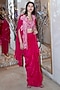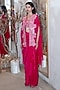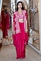 Featuring a fuchsia bustier in organza and silk base with assorted leaves detailing. It is paired with a posy cape and a draped skirt. Style it with jewellery and classic heels for a regal, polished look. Perfect for weddings, festive celebrations and sangeet ceremonies