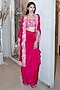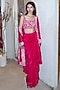 Featuring a fuchsia triangle cape in organza and silk base with assorted leaves detailing. It is paired with a bustier and a draped skirt. Style it with jewellery and classic heels for a regal, polished look. Perfect for weddings, festive celebrations and sangeet ceremonies