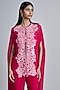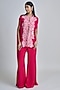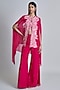 Featuring a fuchsia pink cape in organza base with assorted leaves and floral detailing. It is paired with a tulle bustier and organza pants. Accentuate the set with statement jewellery, embellished heels and a clutch for an elegant look, Perfect for your cocktail, sangeet or engagement ceremony.