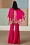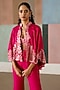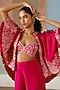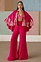 Featuring a fuchsia cape in silk base with embroidery. It is paired with an embroidered bustier and organza pants. Accentuate it with statement earrings and heels for a festive occasion, engagement or sangeet ceremony.