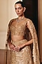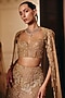 Mishru features an exquisite golden fish-cut layered lehenga in tulle base with assorted leaf motifs and embroidery. It is paired with a corset and and a cape. Style this designer set with zircon jewellery, soft floral hair, and a sleek clutch for a sophisticated bridal ensemble, perfect for your big day or engagement.