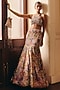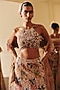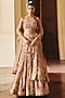 Mishru features an exquisite golden lehenga in tulle base with sequins and assorted leaves embroidery. It is paired with a blouse having a halter neck and a sheer dupatta. Style this designer set with zircon jewellery, soft floral hair, and a sleek clutch for a sophisticated bridal ensemble, perfect for your big day or engagement.