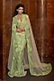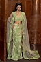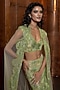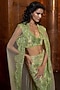 Featuring a green cape in tulle base with a trail. It is paired with an embroidered blouse and a slimcut skirt. Accentuate it with statement jewellery, metallic clutch and bock heels for a stylish ensemble, perfect for mehendi functions, cocktail parties or sangeet nights.