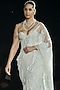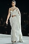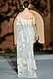 Mishru presents an ivory saree in tulle base. It is paired with a floral corset and an underskirt. Accentuate it with metallic block heels and contemporary jhumkas to bring a daring twist to traditional sangeet styling.