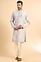 Featuring a cloudy blue kurta in chanderi base with embroidery. It is paired with satin lycra pants. Style it with kolhapuri sandals for a festive occasion, wedding, engagement or sangeet ceremony.