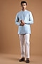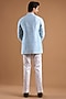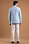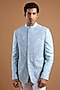 Featuring a cloudy blue bandhgala jacket in silk base. It is paired with a shirt and pants. Accentuate it with classic black or polished leather mojaris and a sleek wrist watch for a refined finish, making it ideal for wedding receptions, cocktail evenings or formal social gatherings.